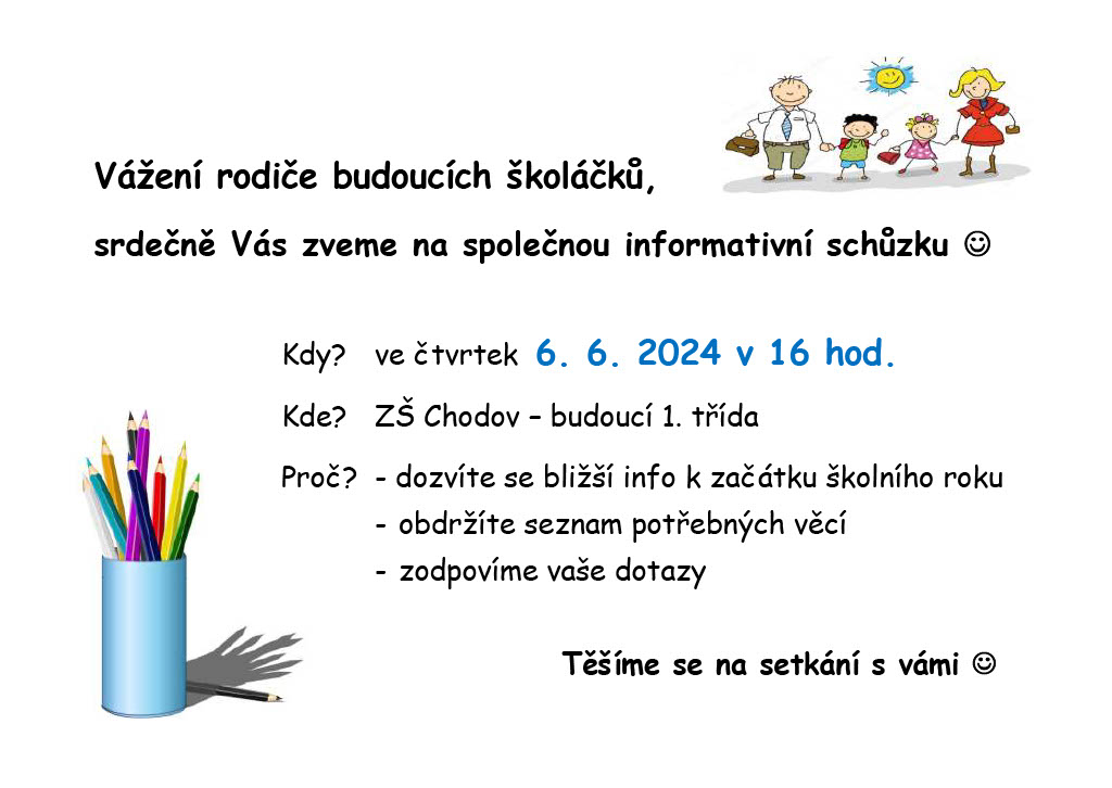 Zveme všechny rodiče budoucích prvňáčků na informativní schůzku.