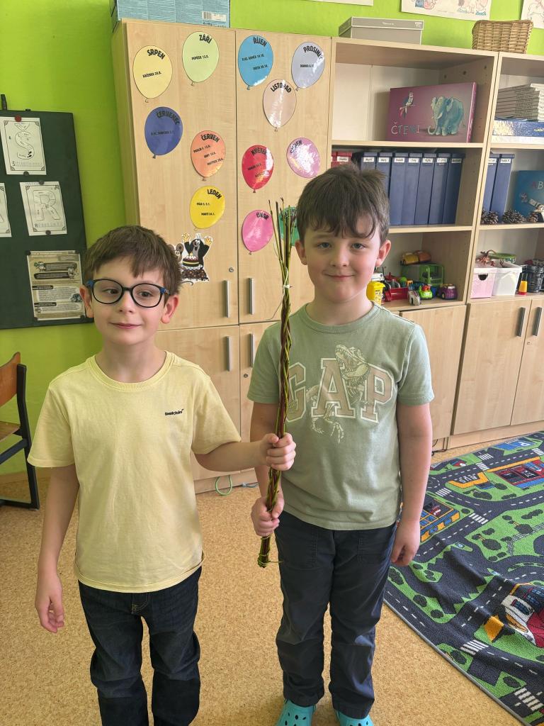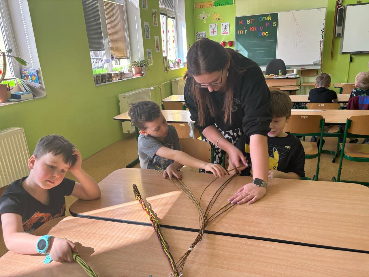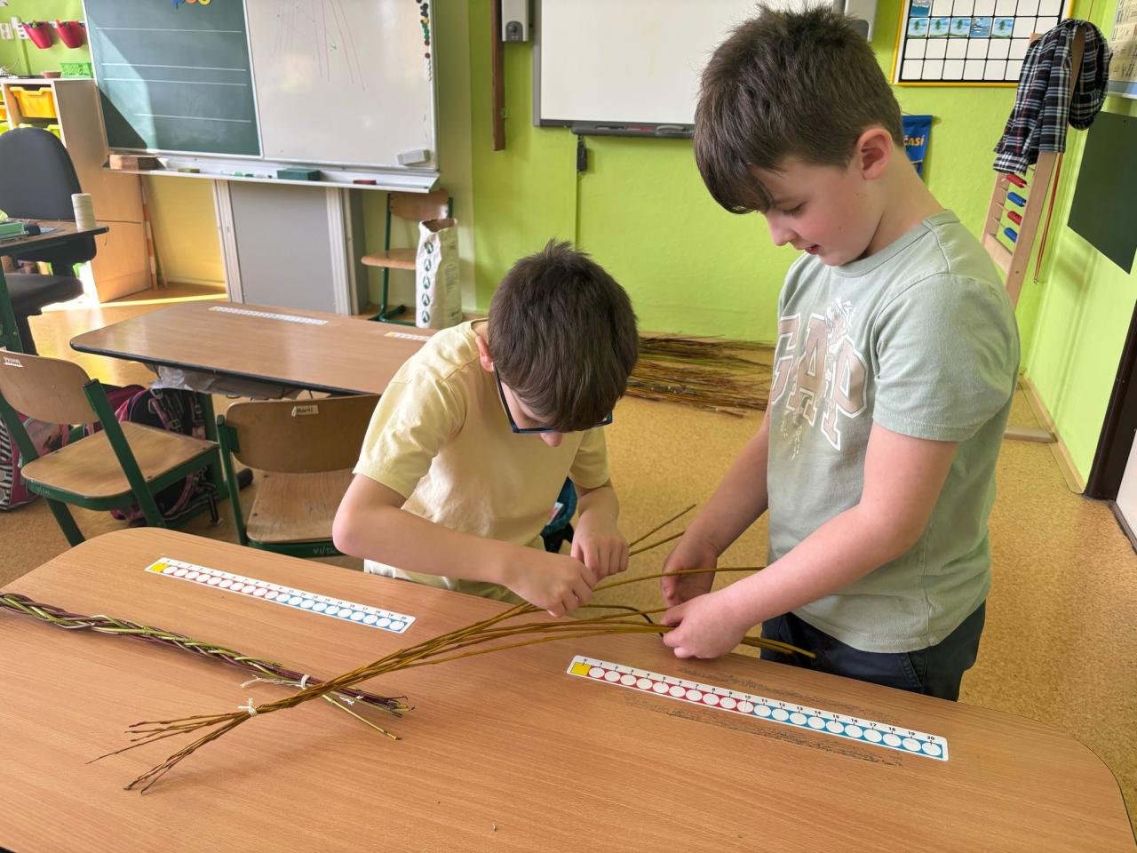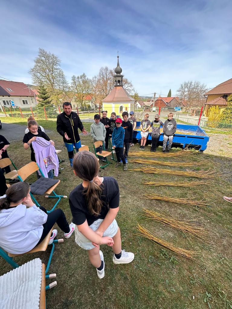 Pletení pomlázek ve všech ročnících. Velké díky patří panu Krotkému a Mathauserovi, kteří dětem vše ukázali a následně naučili.