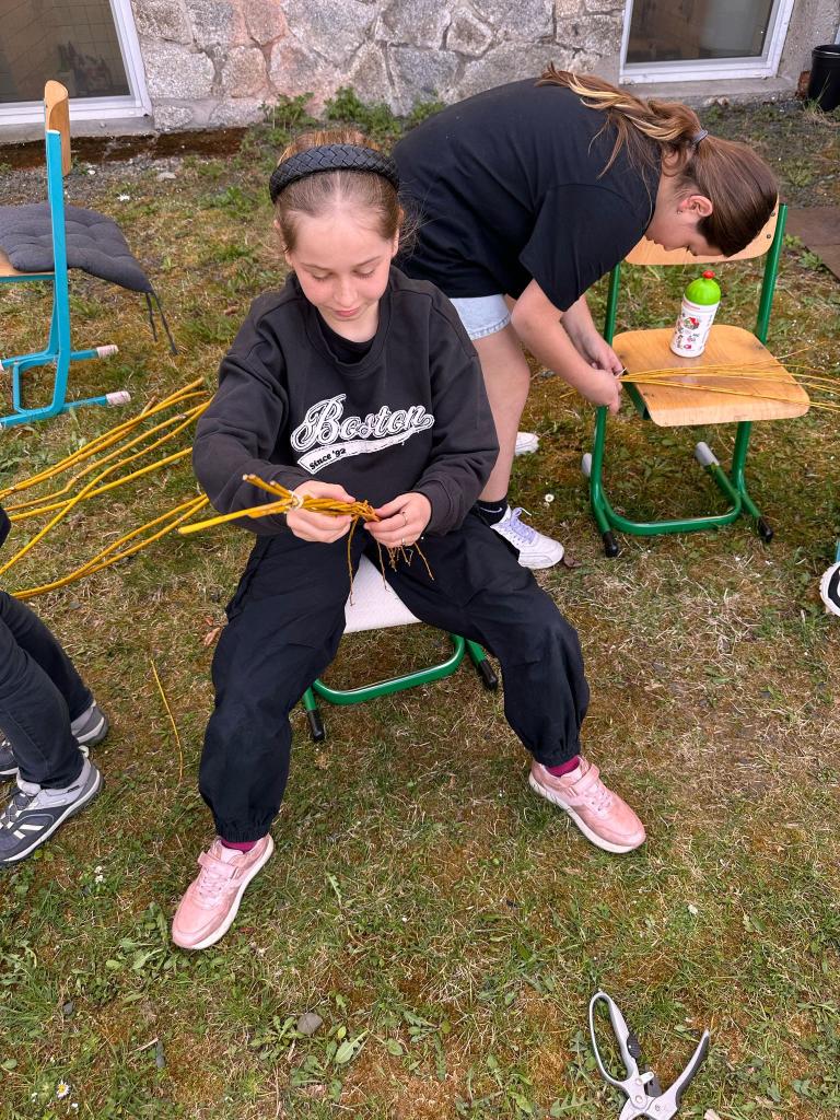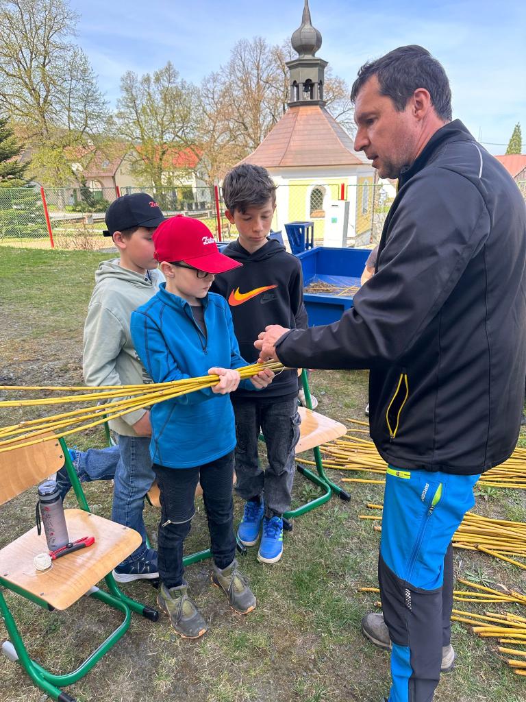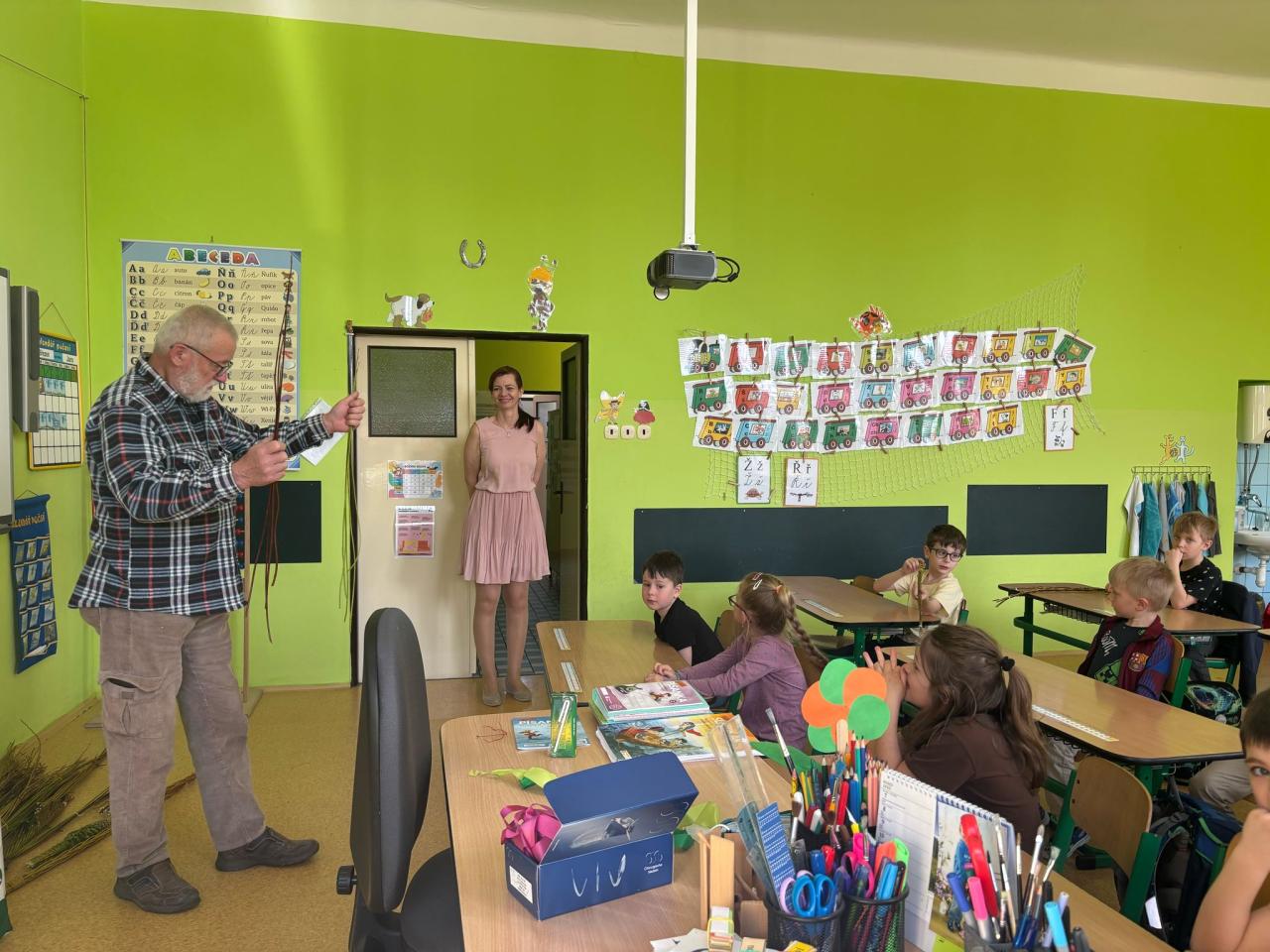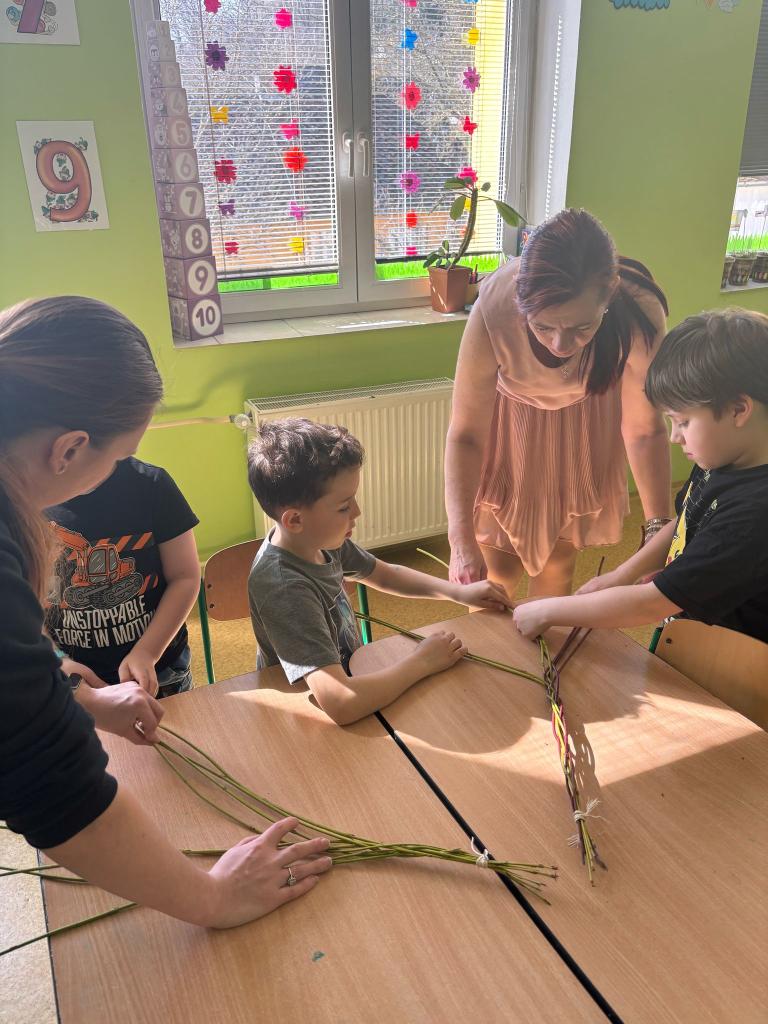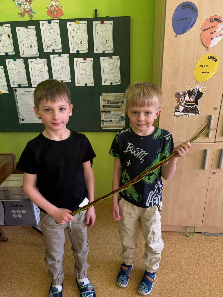 Pletení pomlázek ve všech ročnících. Velké díky patří panu Krotkému a Mathauserovi, kteří dětem vše ukázali a následně naučili.